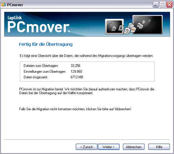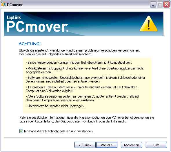 1. Da PCmover auch eine Übertragung zwischen verschiedenen Windows-Versionen unterstützt, muss der Nutzer in solchen Situationen selbst überprüfen, ob ein Programm auf der Zielplattform überhaupt unterstützt wird.2. Musik- und Videodateien mit Copyrightschutz, z.B. DRM, benötigen wahrscheinlich zusätzliche Eingriffe vom Nutzer, damit diese auf dem Zielrechner abgespielt werden können.3. Programme mit speziellem Copyrightschutz müssen wahrscheinlich ebenfalls auf dem Zielrechner nachbearbeitet werden, damit sie ablauffähig sind.4. Sollten auf dem Zielrechner bereits Programme installiert sein, dann muss der Nutzer durch vorbereitende Eingriffe, z.B. gezielte Deinstallation, sicherstellen, dass im Lauf der Migration die gewünschte Version auf dem Neu-PC installiert wird.Die Hinweise sind zum Teil sehr offen gehalten, da die Situation bzgl. Software- und Copyrightschutz unübersichtlich ist. Dem Nutzer muss klar sein, dass die Migration Alt -> Neu auch mit der Unterstützung eines Werzeuges wie laplink keinesfalls vollautomatisch und absolut ohne Hürden durchgeführt werden kann. Dazu ist die Software- und Medienbranche zu dynamisch und zum Teil auch zu unzuverlässig, was die Einhaltung von Standards und Best Practices betrifft.Hardware-Treiber werden auf keinen Fall migriert. Hier in einer Reihe von Screenshots der Ablauf einer Migration: 1. PCmover auf dem Neu-PC starten und in den Wartezustand bringen. 2. PCmover auf dem Alt-PC starten.
