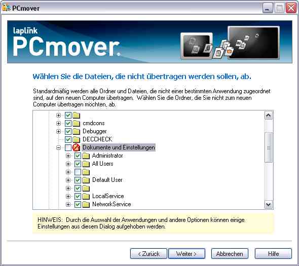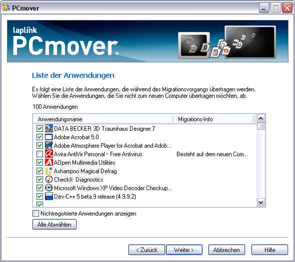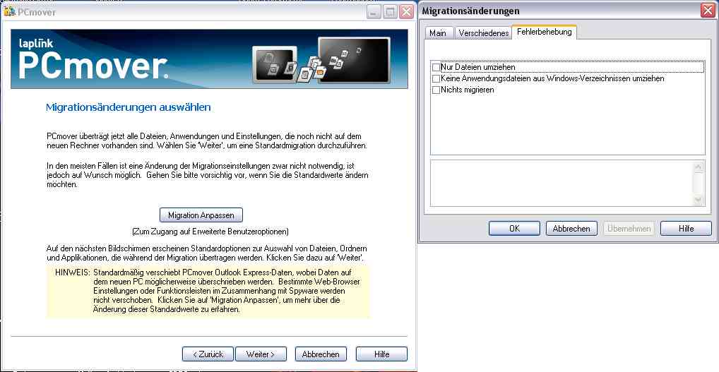 Windows XP migrieren - Teil 2 In diesem Teil der Beiträge zum Thema XP Migration geht es um die direkte Übertragung der installierten Anwendungen von dem Alt-PC auf den Neu-PC.Häufig entstehen hier Probleme, weil man die Datenträger für ein gekauftes Programm nicht mehr hat, diese nicht mehr lesbar sind, oder dass man den Lizenzschlüssel nicht mehr zur Verfügung hat. Eine Neuinstallation ist dann nicht mehr möglich. Ausserdem stellt sich bestimmt jeder Nutzer die naheliegende Frage, ob es nicht Möglichkeiten für eine automatisierte Übertragung hat. Es gibt eine Menge Softwarehersteller, die Systemwerkzeuge für die verschiedensten Anwendungsbereiche entwickeln. Da wird doch bestimmt einer dabei sein, der dieses Thema gelöst hat?Offen gesagt, sieht die Marktlage für solche Tools schlecht aus, besonders für solche, die die Programme übertragen. Wesentlich mehr Möglicheiten hat man, wenn man nur Einstellungen und Dateien automatisch übertragen möchte, hier gibt es sogar eine in Windows XP eingebaute Funktion. Wir arbeiten in diesen Beiträgen jedoch vorrangig die Software-Seite ab, da man die Programme natürlich braucht, um die Daten bearbeiten oder einsehen zu können, oder umgekehrt gesagt die Daten ohne die dazugehörigen Programme wenig Sinn auf einem PC machen.Wir haben eines der sehr wenigen verfügbaren Werkzeuge für eine Anwendungsmigration getestet und stellen es hier etwas genauer vor. Der Hersteller der Software nennt sich laplink ( http://www.laplink.com/ ), das Software-Produkt hat den Namen PCmover. laplink ist ein schon lange in der PC-Industrie etablierter Hersteller von verschiedensten Werkzeugen für den professionellen und privaten Bereich. PCmover kostet aktuell 49,95 $ als Download, dafür erhält man die Lizenz für die Migration eines PC's.Die folgenden Funktionen werden von PCmover unterstützt: