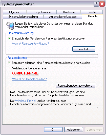 Andere Funktionen lassen sich per Open Source leicht und kostenfrei hinzufügen, als Standardbeispiele seien genannt FTP Server und Web Server.Um einer Frage vorzubeugen: Legt man Mediendateien auf einem XP-Rechner ab, kann man diese von einem anderen Rechner im Heimnetz problemlos abspielen. Eine Streaming-Software ist nicht notwendig.Sofern man ein System mit guter Hardware-Ausstattung hat, lassen sich üblicherweise auch die Funktionen zum Stromsparen ausreichend gut konfigurieren, sodass man den Alt-PC bedenkenlos als XP Server nutzen kann. Eventuell möchte man das System in den Keller verfrachten und es soll sich bei Inaktivität automatisch schlafen legen und per LAN geweckt werden können. Sofern diese Funktionen von der Hardware unterstützt werden, kann man Windows XP problemlos entsprechend konfigurieren.Aber kommen wir zurück zum Thema alte Daten und alte Anwendungen und gehen davon aus, dass der bisher genutzte PC weiterhin für zumindest eine Übergangszeit genutzt werden kann. Alte Daten und Anwendungen belässt man dann auf dem Alt-Rechner und nutzt diese solange, bis sie nicht mehr benötigt werden, oder man bereitet die Daten dort für eine Migration auf. Wie das im einzelnen geschieht, hängt von den Anwendungen ( alt und neu ) ab und kann hier nicht aus einem allgemeinen Blickwinkel heraus betrachtet werden.Jedoch wollen wir abschliessend noch beschreiben, wie man sich die parallele Nutzung zweier PC's erschliessen kann.Obwohl nicht zwingend notwendig, gehen wir davon aus, dass man über ein Heimnetz verfügt und beide Rechner daran anschliesst, oder zumindest eine Direktverbindung per USB- oder Cross-Connect-Kabel herstellt.Am einfachsten ist es natürlich, beide Rechner nebeneinander stehen zu lassen. Hat man zu wenig Platz oder möchte aus anderen Gründen nur einen Monitor und/oder nur eine Maus/Tastatur nutzen, dann schafft man sich einen KVM-Switch an und verbindet beide Computer mit nur einem Peripherie-Satz.Sollten Alt-PC und Neu-PC in verschiedenen Räumen installiert werden, dann benötigt man eine Möglichkeit zur indirekten Nutzung. Prinzipiell bieten sich hier zwei bereits in Windows XP eingebaute Techniken an: Remoteunterstützung oder Remotedesktop. Letztgenanntes Feature steht nur den Besitzern einer Windows XP Professional – Lizenz zur Verfügung. Remotedesktop ist generell zu bevorzugen, da diese Funktion einfacher zu handhaben und ausserdem etwas sicherer ist.Eine Remoteünterstützung muss per EMail oder MSN Messenger erst angefordert werden, setzt also Zusatzdienste und entsprechend Accounts voraus.Für unsere einfache Anwendung, den Zugriff und die Steuerung eines zweiten Rechners im Heimnetz, ist der Remotedesktop eindeutig vorzuziehen. Ein paralleles Arbeiten lokal / entfernt ist damit zwar auch nicht möglich, dieses könnte man sich nur mit einer professionellen Terminal Server Software erschliessen, mit der sich mehrere Nutzer auf dem Zielrechner anmelden können. Ausserdem ist es mit solch einer Software oft möglich, dass Peripheriegeräte des eigenen Rechners genutzt werden können, z.B. bearbeitet man ein Dokument auf dem entfernten Rechner per Terminal Services, druckt es aber auf einem lokalen Drucker aus. Das ist mit Remotedesktop nicht möglich. Es gibt erschwingliche Lösungen, z.B. Thinstuff, für 69 € erhält man eine Dreierlizenz. Das bedeutet, dass man auf den Terminal Server von bis zu 3 Clients gleichzeitig zugreifen kann. Eventuell soll der alte Rechner in der Familie weiterbenutzt werden, dann ist eine gemeinsame Nutzung per Terminal Services ideal, da der lokale Nutzer den parallelen Zugriff von einem entfernten Rechner nicht direkt erkennen, aber auch sonst kaum bemerken wird.Zum Abschuss dieses Berichts eine kurze Anleitung, wie man unter XP Professional einen Remotedesktop aufbaut:
