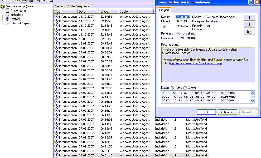 Geheimer Windows Update Microsoft hat im August Komponenten von Windows Update ( WU ) auf einen neuen Stand gebracht. Nachdem WU erst im Juni einen Update über den Standardprozess erhielt, erfolgte der im August auf geheime Art. Bekannt gemacht wurde dieser Update durch eine Schwemme von Berichten im Internet oder in Blogs. In den USA erhielt er das Etikett 'Stealth' Update. Microsoft hat diese Systemänderung vorgenommen, ohne auf die Konfiguration des Systems Rücksicht zu nehmen. Selbst wenn ein Nutzer automatische Updates deaktiviert hatte, wurde der Prozess ausgeführt - vorausgesetzt natürlich, dass der Rechner irgendwann in den letzten Wochen eine Verbindung ins Internet hatte. Wie kann man erkennen, dass man den 'Stealth' Update erhalten hat? 1. Dateiversionen prüfen Die folgenden Dateien weisen nach dem Update die Version 7.0.6000.381 und das Änderungsdatum 30.07.2007 auf cdm.dll Dabei ist die DLL wups2 vollkommen neu. 2. Mittels Event Viewer prüfen, was Windows Update in den letzten Wochen gemeldet hat. Z.B.
