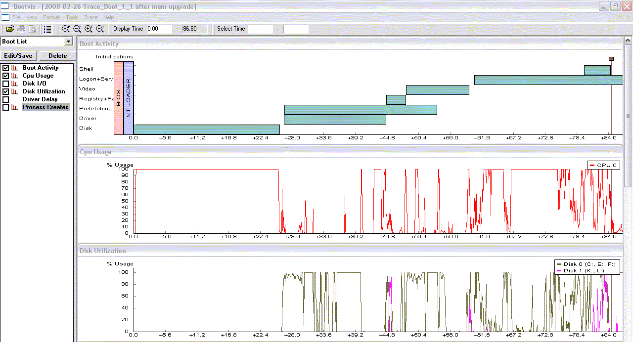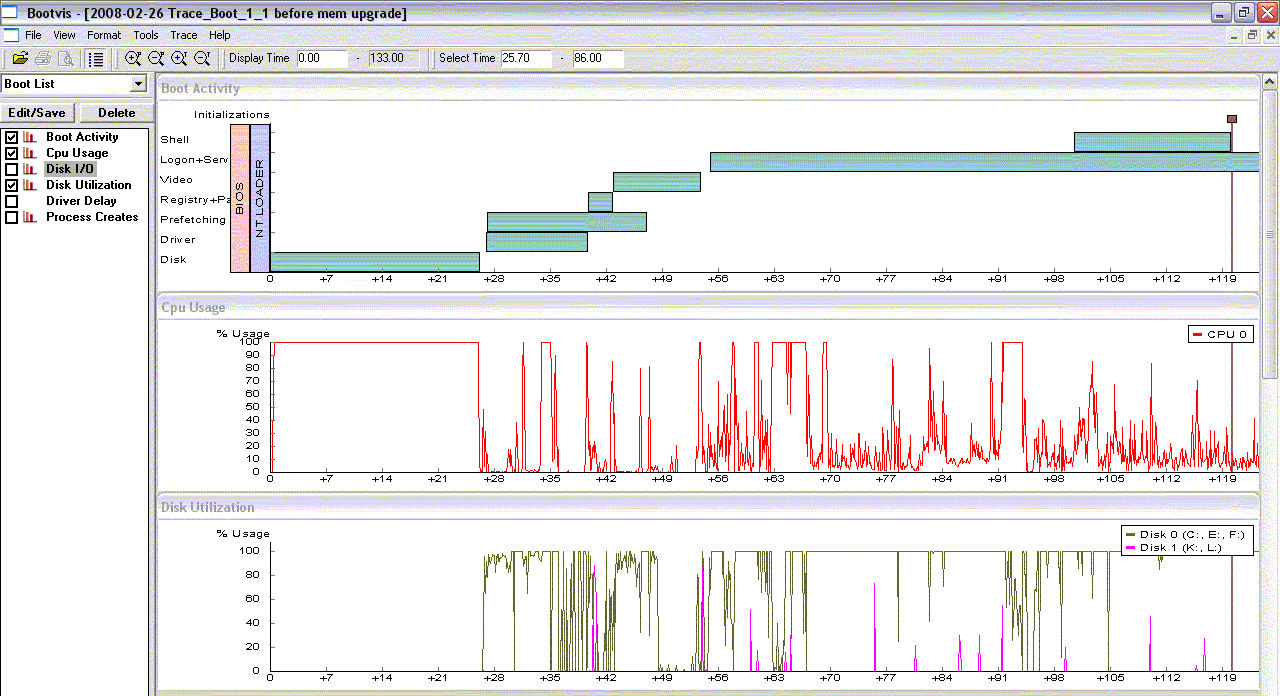 XP Startup-Beschleunigung durch Speicherupgrade Kaum ein Thema beschäftigt die Nutzer von Windows–PC's mehr als die Leistung. Und hierbei insbesondere die Zeit, die für den Startvorgang benötigt wird. Hier ein Beispiel, wie gerade dieses Thema schnell und ohne Risiko behandelt werden kann. Jeder Eingriff in die softwareseitige Konfiguration kann das System destabilisieren, deshalb stellen wir hier einen zwar offensichtlichen, jedoch häufig vergessenen Ansatz vor: Speicherupgrade. Das Verhalten des Systems beim Startup kann mit einem Microsoft-Tool namens Bootvis.exe vollständig und detailliert aufgenommen und grafisch dargestellt werden. Dieses Werzeug steht Systemherstellern und Softwareentwicklern kostenlos zur Verfügung. Die PC-Industrie hält eine Laufzeit für einen Kaltstart von bis 30 Sekunden für angemessen und diese Zeit sollte unter normalen Umständen auch nicht überschritten werden. Ein mehrere Jahre genutztes System mit vielen Softwareinstallationen und vielen durchgeführten Updates kann jedoch in Sachen Performance extrem entgleisen. Hier ein Beispiel für die grafische Darstellung eines Boot-Vorgangs bei einem Windows-XP-System, das mehrere Jahre intensiv genutzt wurde: Die Laufzeit des Startvorgangs wird mit fast 3 Minuten gemessen. Es fällt auf, dass die Auslastung der CPU stark schwankt, die der Systemplatte jedoch fast durchgehend 100% beträgt. Ist also die Festplatte der Engpass? Zumindest war sie vor dem Test komplett defragmentiert worden. Die Disk ist ganz offensichtlich der Bremser, jedoch ist ein Upgrade der Festplatte teuer, aufwändig und nicht ganz einfach. Es kann sein, dass zusätzlich zur Disk auch ein neuer, externer und aktuellerer Controller installiert werden muss. Das macht den Upgrade diffizil und er kann zusätzlich in unerwartete Probleme laufen. Beispielsweise kann es je nach Mainboard / BIOS Probleme beim Booten über einen externen HD-Controller geben. Beim Startvorgang werden Kernkomponenten von XP ausgeführt, Treiber geladen und residente Applikation gestartet. Viele dieser Vorgänge laufen parallel ab und benötigen Zugriff auf die Systemplatte. Deshalb liegt die Idee nahe, dass zusätzlicher Hauptspeicher helfen kann, da dann viele Daten und Softwarekomponenten im Speicher gehalten werden können. Wir haben es getestet und in dem System ein 1 GB – Module zusätzlich installiert. Davor waren lediglich 256 KB verfügbar. Danach sah der Startvorgang folgendermassen aus: Zeitgewinn:
